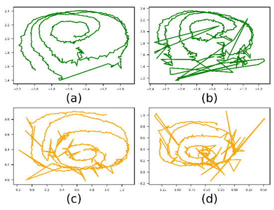 Example of real and simulated gaze vectors. The parameters for the simulated vectors are: perror = 0.1, rerror = 0.5 and σprec = 0.005. (a) and (b) are the left and right vectors from a real experiment and (c) and (d) are the left and right simulated ones.