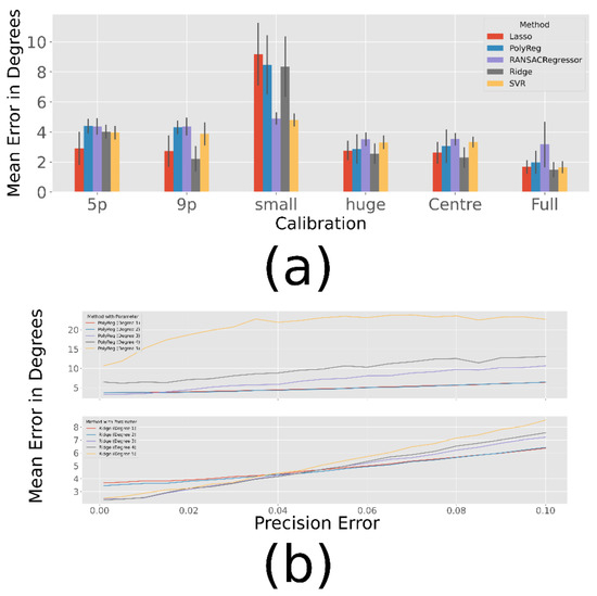 The best results for different precision qualities are shown in Table 3. As expected, the error increases as the precision decreases. In most cases, however, the ridge regression gives the best results, except for the small subject pattern, which seems to cover too small a range to estimate a good polynomial. This could explain why the only method that does not estimate a polynomial, usually leads to the best results. Furthermore, Figure 6 (b) shows the course of the polynomial and ridge regression for increasing precision errors in the centre calibration. In addition, graphics for the other methods can be found in the appendix. As shown in the figure, the higher degrees of ridge regression work better for very small errors, while they are still slightly better for high errors.