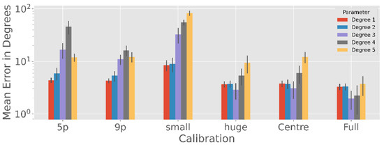 Degree 1 and 2 results are very similar for each calibration (p > 0.05 except of 5-point calibration with p < 0.001). Degree 3, 4, and 5 are usually better as the number of calibration points increases (p < 0.001), except for Degree 3 where no significant differences in performance between 9 point and centre calibration can be found (p > 0.05) and 9 point is slightly better than subject huge (p < 0.001). Calibration Subject small results in the largest error for each degree (p < 0.001).