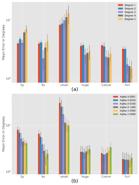 Since degree 3 is usually one of the best, Figure 8 (b) shows the different results of degree 3 with different weighting parameters. There are significant differences between the chosen alphas in the 5-point (F = 189, p < 0.001), 9-point (F = 209, p < 0.001), subject small (F = 158, p < 0.001), subject huge (F = 6.7, p < 0.001) and centre (F = 23, p < 0.001). No significant difference is found between alphas for the full calibration (F = 1.3, p > 0.05). As the figure shows, a larger alpha lead to better results (p < 0.001) for a small number of calibration points (5- and 9-point calibration) or a small calibration area (subject small). Only in the 5-point calibration and subject small for alpha equal to 1 and 2 there is no statistically significant difference (p > 0.05). In the case of Subject huge and Centre calibration, there are no significant differences between α = 0.0001, … ,0.1 (p > 0.05). Only the error for alpha equal to 1 or 2 is significantly larger than for the lower alphas (p < 0.001).