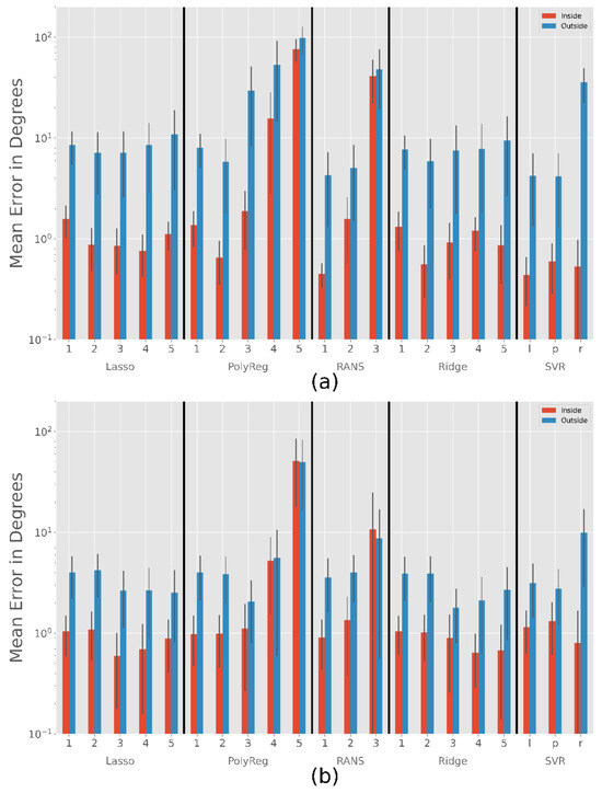 Figure 9 shows the average error occurring during interpolation and extrapolation of the calibration range. While the large coverage calibration pattern (Figure 4 €) has only a few points outside this range, the small pattern (Figure 4 (f)) has many points outside. Shrinkage methods (ridge and lasso regression) work relatively well in both cases. Note that these methods have an α parameter to prevent overfitting. As a consequence, increasing the polynomial’s degree does not have a negative impact. Figure 9 shows the best results achieved for both cases. For the large range, a small alpha value such as α = 0.1 and for the small range a large alpha value such as α = 2 could be used instead of changing the degree. However, it seems better to decrease the degree instead of increasing the alpha, as shown in Table 4.