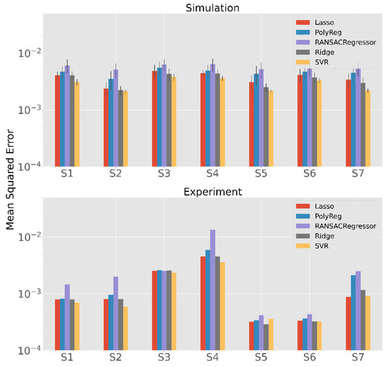 With the exception of SVR, ridge regression seems to outperform the other methods mostly (p < 0.001). In terms of numbers, the mean MSE of the ridge regression is for the simulation about 20% better than that of the usually used polynomial regression which is a significance improvement (p < 0.001). In the real-world experiment, it is on average about 15% better. The differences are quite small in S1 and S3, but they are clearly visible in the others.