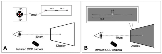 The participants were seated in front of a table with their heads stabilized using a head positioner and were examined under binocular viewing. A computer monitor (Diamondcrysta®, RDT222WM-S; Mitsubishi, Tokyo, Japan) displayed the target located at 40 cm from the participant’s eyes. The monitor resolution was 1680 × 1050 pixels, and the refresh rate was 60 Hz. Each trial started with central fixation.