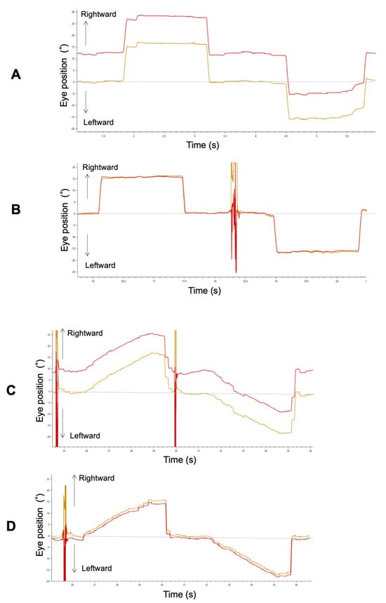 A typical example of a horizontal saccade (A: pre-surgery, B: post-surgery) and smooth pursuit (C: pre-surgery, D: post-surgery) waveform in Patient 3. Red and yellow lines indicate the left and right eye, respectively.