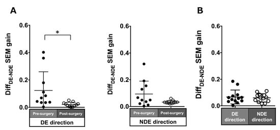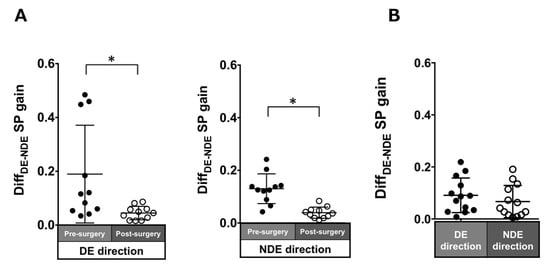 Patients with ACE: In the pre-surgical data, DiffDE-NDE gain in the dominant and non-dominant eye directions were 0.12 ± 0.14 and 0.09 ± 0.1, respectively. These values improved post-surgery but were significant in only the dominant eye direction (dominant eye direction: 0.02 ± 0.02, p = 0.007; non-dominant eye direction: 0.03 ± 0.01, p = 0.1; Figure 5A).
