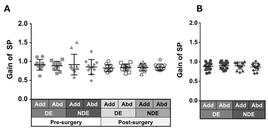 Comparison of pre- (solid gray symbols) and post-surgery (open gray symbols) smooth pursuit gain in patients with acquired comitant esotropia (A). Pursuit gain in normal participants (B). Lines indicate mean with standard deviation. Add: adduction, Abd: abduction, DE: dominant eye, NDE: non-dominant eye, SP: smooth pursuit.