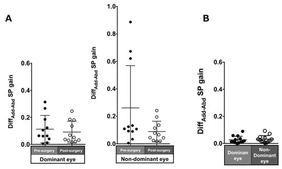 Patients with ACE: The DiffADD-ABD gain post-surgery in saccades in each eye was smaller compared to pre-surgery, although the difference was not significant (dominant eye: 0.16 ± 0.13 to 0.06 ± 0.05, p = 0.17; non-dominant eye: 0.2 ± 0.18 to 0.07 ± 0.06, p = 0.07; Figure 4A).