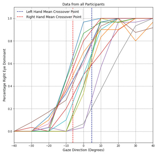Figure 5 visualizes the percentage of a participant being right-eye dominant against each viewing angle for each participant, averaged across all trials and target distances. At the outermost viewing angles, all subjects viewed the targets with the eye corresponding to the respective side. Thus, the targets at -40° were viewed with the left eye, while the subjects used their right eye at 40° viewing angles. On average, when using their right hand, participants switched from their left to their right eye at a gaze angle of around -6.13° (SD=9.67), as shown in Figure 5 via the line indicating the mean crossover point. For the left hand, the mean crossover point was located at 4.79° (SD=7.80), at which participants switched from their left to right eye.