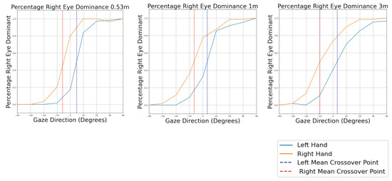 All three target distances display similar trends regarding the percentage of right eye dominant cases against viewing angle (Figure 6). At 0.53m distance, when using their right hand, participants switched from left to right eye at an average gaze angle of –5.74° (SD=5.27). At 1m targets, when using the right hand, the left to right eye switch occurs at a mean angle of -6.49° (SD=12.44). When viewing targets at 3m and using the right hand, participants switched on average at -9.68° (SD=10.60). However, the average viewing angle at which participants switched from left to right eye did not differ significantly with increasing target distance.