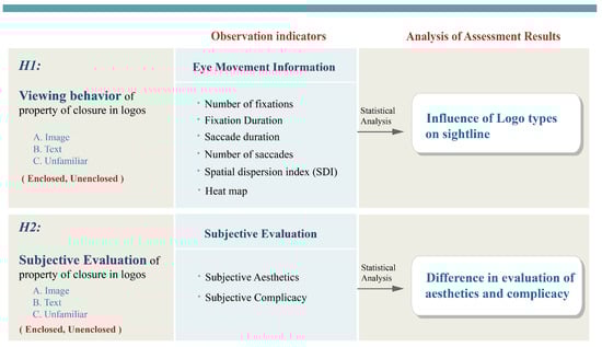 The primary purpose of this experiment is to explore the principle of closure and the psychological process of vision. The experiment manipulated the closure property of logos and its influence on eye movement information to investigate critical factors that affect the viewing and recognition of logos, particularly paying attention to the differences in sightline distribution and subjective evaluation between enclosed and unenclosed logos. This research can be a reference for visual design creation and art education. The research structure is shown in Figure 4.