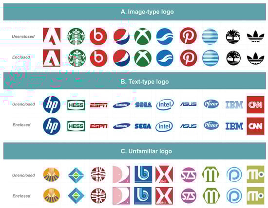 The experimental pictures are selected from the well-known brand logos of Fortune Global 500 ranking companies from the American "Fortune" magazine. The experimental photos were then screened using the focus group interview method with three invited experts, each having over ten years of field experience. The experts were interviewed, and dialog was exchanged in group discussion to select photos that pertain to the Gestalt principle of closure. The experts then gave a score from 1 to 7 points on the Likert scale, with 1 point indicating very unfitting and 7 points indicating very fitting. This was performed for all enclosed and unenclosed logos as experimental samples. Finally, an additional set of experimental pictures was produced according to the principle of inductive arrangement by Gestalt psychologist Zakia (2002). The previously selected logos were re-drawn as the experimental group that conforms to the closure principle into a wholly enclosed and partial group. The enclosed graphics and text logos and unenclosed graphics and text logo groups each contained ten logos for 40 pictures. In addition, to mitigate the effect of currently existing logs having imprinted on the subjects, five additional self-designed brand new and never before seen logos were added to each of the four above groups for 20 brand new pictures. This makes 60 pictures for the experiment (as shown in Figure 5). Each picture is 1000*1000 pixels in size.