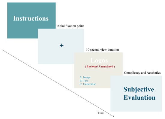 At the beginning of the experiment, the participants practiced to become familiar with the operation of the experiment setup using the given instructions. In the formal experiment, images of logos were presented. Under the condition of comprehensively viewing the picture, the subjects' sightline information was recorded entirely in the process. There were 60 images in the experiment, and each image was presented for 10 seconds, the order of which was randomly determined by the computer. Drift correction was performed for every ten images shown. After the images were all shown, the subjects were asked to conduct a subjective evaluation of the 60 logo images. A complicacy score of 1 to 7 points, the most straightforward scoring 1 to the most complicated scoring 7, and an aesthetics score of 1 to 7 points, 7 points being very good-looking, were given. The total experimental time lasted 15 minutes, and the experimental process is shown in Figure 6.