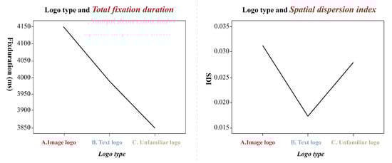 Further analysis of logotypes reveals that the distribution of fixation is significantly different (as shown in Table 2). Due to changes in cognition, Image-type logos exhibited the highest SDI value, more dispersed fixation points, and the most extended total fixation duration. The distribution of fixation was more concentrated for text-type logos (as shown in Figure 8). The control group contained newly designed logos that had never been seen by the public before. This group exhibited the shortest total fixation duration and had the highest complicacy and least aesthetic scores, which implies that the visual psychology for logos of all types may be influenced by familiarity. Michailidou (2005) and Michailidou et al., (2008) also pointed out that different types of logos exhibit different subjective complicacy and cognitive load.