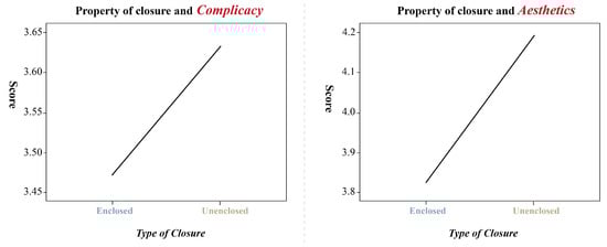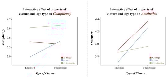 The presence or absence of enclosure on the image had a significant main effect (F(1, 20) = 8.155, p < 0.01) on the complicacy-dependent variable and was also significantly affected by image type (F(2, 40) = 10.218, p < 0.01) There is a significant interaction between the two (F(2, 40) = 9.672, p<0.01), and the degree of complexity for enclosed images is different, indicating that enclosed logos have lower complicacy than non-enclosed logos, especially for text-type logos which have significantly lower complicacy than image-type logos and unfamiliar enclosed logos. The presence or absence of enclosure had a significant main effect (F(1, 20) = 7.452, p < 0.05) on the aesthetics-dependent variable and was insignificantly affected by image type (F(2, 40) = 1.125, p>0.05). Significant interaction exists between the two (F(2, 40) = 6.305, p<0.01), and conformity to the principle of enclosure have significantly different levels of aesthetics score, indicating that unenclosed logos are better looking than enclosed logos, as shown in Figure 9, Particularly, imagetype logos are significantly more aesthetically pleasing than text-type logos and experimental unfamiliar non-enclosed logos, as shown in Figure 10.