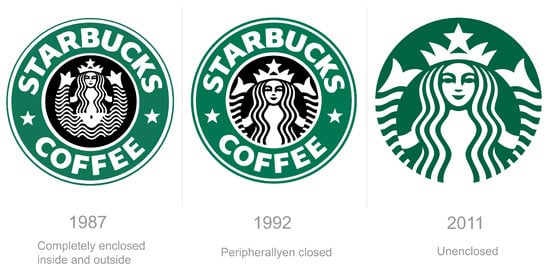 The evolution of Starbucks logo design, redesigned from being completely enclosed to an open logo conforming with the principle of closure