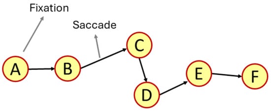 Representative examples of a visual scan path, highlighting one eye fixation and a saccadic movement. The scan path sequence created by the visual scan path is ABCDEF.