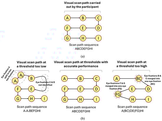 Simplified example showcasing the impact of thresholds values on scan paths sequences. Note: Figure 2(a) contains the visual scan path (and the scan path sequence) of a participant instructed to follow a dot (i.e., stimuli) moving in an ideal manner back and forth across the display; Figure 2(b) showcases simple examples of visual scan paths (and the scan path sequences) created at thresholds too low, acceptable, and too high.