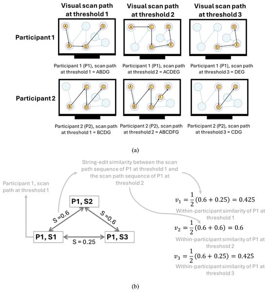 Figure 4(a) showcases an example of the between-participant comparisons similarity calculated for the scanpath sequences created at two thresholds (1 and 2) carried out by three participants (P1, P2, and P3). Equation (3) is applied in Figure 4(b) to compare all possible combinations of two-scan path sequences among participants. The results indicate that the threshold with the highest average string edit similarity between participants would be threshold 2 (0.716 at threshold 2 vs 0.666 at threshold 1).