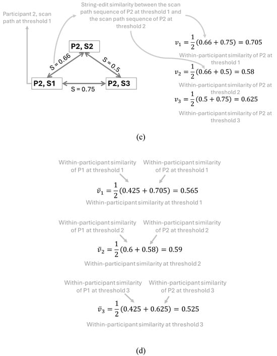 Figure 5(a) shows an example of the within-participant comparisons similarity being calculated for the scan path sequences at three thresholds (1, 2, and 3) carried out by two participants (P1 and P2). Equation (4) is applied in Figure 5(b and c) to calculate the threshold that creates the scan path sequence most similar to the scan path sequences at every other threshold for each participant. Lastly, equation (5) is applied in Figure 5(d), showcasing that the threshold with the highest average similarity to every other scan path sequence among the two participants would be threshold 2 (0.59 at threshold 2 vs 0.565 at threshold 1 and 0.525 at threshold 3).