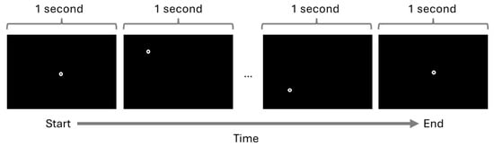 A total of 322 college students (171 self-identifying as male, 151 as female; average 21.99 years of age, SD: 4.22) at Texas State University completed the RAN task. A representative visualization of the task can be observed in Figure 6. Participants were instructed to fixate and follow a bullseye target. Participants were shown 100 bullseye targets, each appearing on the display for 1 second, after which it would disappear and re-appear on another location on the display. The locations bullseye targets appeared were randomly selected across participants, with the exception of the starting and ending locations, which were both at the center of the display.