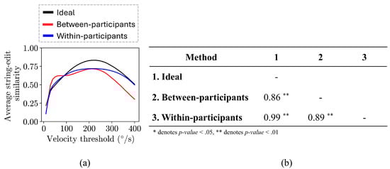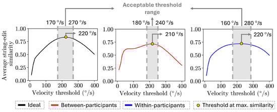 Lastly, the gaze velocity threshold values with the highest average string edit similarity identified using the within-participant and between-participant comparisons outperformed the 30 °/s benchmark threshold. More specifically, the 210 °/s and 220 °/s threshold values identified by applying the between-participant and within-participant comparisons had an average string edit similarity of 0.831 and 0.833 on the ideal trend, respectively. On the other hand, the 30 °/s benchmark threshold had an average string edit similarity of 0.415 on the ideal trend.