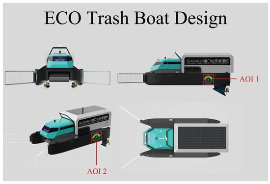 The experiment included two stimuli. Stimulus 1 was a page displaying four views of the ecotrash boat design (Figure 1), presented on a monitor. The eco-trash boat was designed by the researchers to handle waterborne waste and enhance environmental sustainability. On the side of the eco-trash boat, there was a sustainability graphic, which is designed by the researchers (Figure 2), visible in both the right and perspective views. The areas containing the sustainability graphic in the four-view page were designated as AOI 1 and AOI 2 (Figure 1). These AOIs were defined during data processing for analyzing eye movements, but participants were neither shown nor informed about the AOI regions. Stimulus 2 was a 15-page design description, printed in color. The design description of the eco-trash boat aimed to provide participants with a comprehensive understanding of the product's appearance, functionality, principles, and sustainability concepts. One page is the title, one page displays the dimensions, one page shows the overall render, one page presents the structure map, seven pages are dedicated to function introduction, and four pages illustrate usage scenarios (Appendix).
