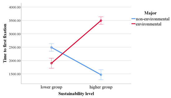 In the results for time to first fixation, the main effect of major was significant, with non-environmental participants having a significantly shorter time to first fixation than environmental participants, F (1, 46) = 76.051, p < .001, η² = .623. The main effect of sustainability level was also significant, with the lower group having a significantly shorter time to first fixation than the higher group, F (1, 46) = 12.210, p < .001, η² = .210. The interaction effect between major and sustainability level was significant, F (1, 46) = 252.624, p < .001, η² = 0.846 (Figure 5).