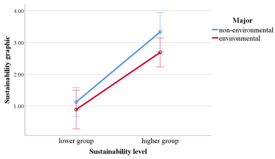 In the results for sustainability graphic, the main effect of major was not significant, F (1,46) = 2.706, p = .107, η² = .056. The main effect of sustainability level was significant, with the higher group recalling significantly more sustainability graphics than the lower group, F (1,46) = 55.863, p < .001, η² = .548. The interaction effect between major and sustainability level was not significant, F (1,46) = .584, p = .449, η² = .013 (Figure 6).