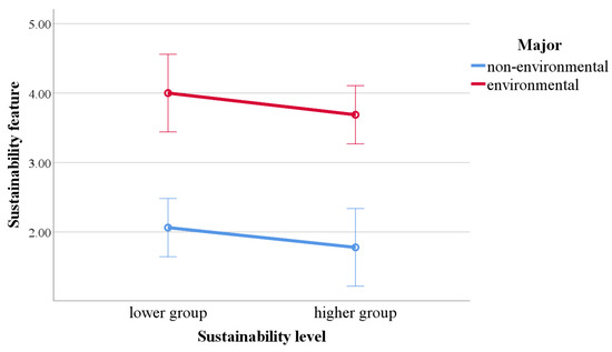 In the results for sustainability feature, the main effect of major was significant, with non-environmental participants recalling significantly fewer sustainability features compared to environmental participants, F (1,46) = 61.410, p < .001, η² = .572. The main effect of sustainability level was not significant, F (1,46) = 1.480, p = .230, η² = .031. The interaction effect between major and sustainability level was not significant, F (1,46) = .003, p = .955, η² < 0.001 (Figure 7).