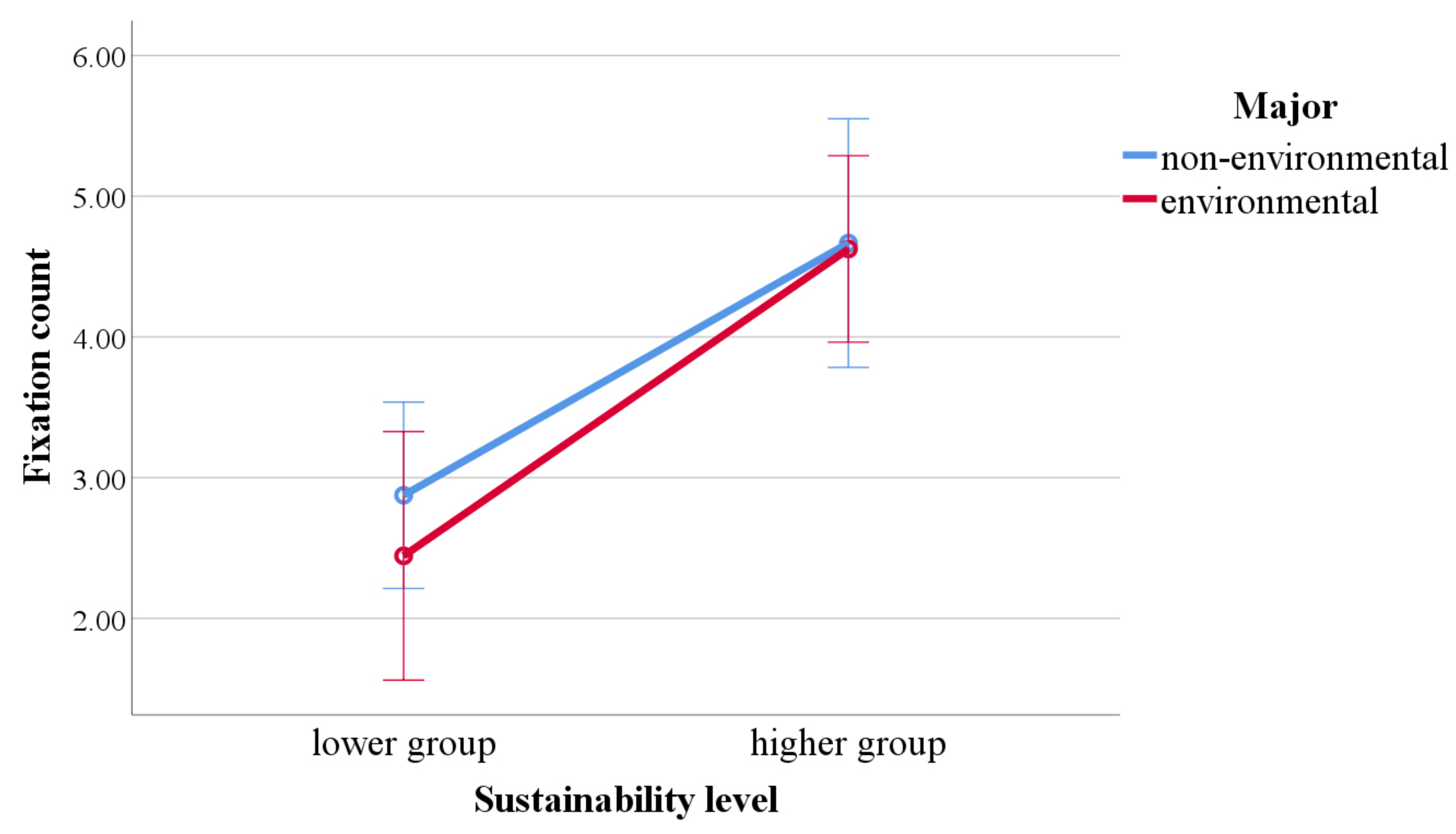 In the fixation count results, the main effect of major was not significant, F (1, 46) = 0.371, p = .546, η² = .008. The main effect of sustainability level was significant, with the fixation count in the higher group being significantly greater than that in the lower group, F (1, 46) = 26.220, p < .001, η² = .363. The interaction effect between major and sustainability level was not significant, F (1, 46) = .251, p = .619, η² = .005 (Figure 4).