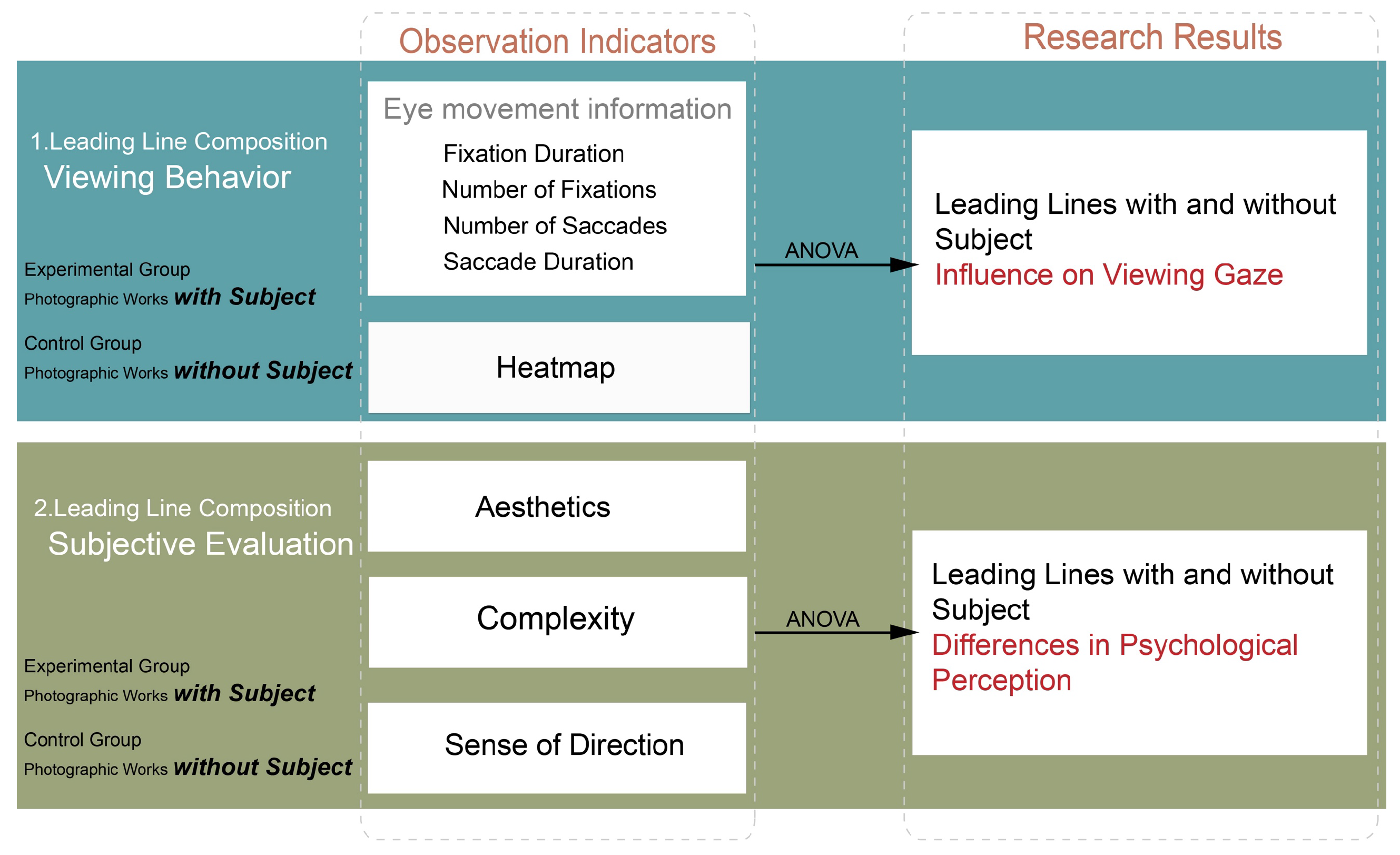 The focus of the study was to investigate how leading line composition and subject elements influence viewers’ gaze trajectories, gaze distribution, and fixations as well as their effect on an image’s visual appeal. Subjective evaluations were made by 34 participants and combined with eye movement data to explore the influence of leading lines and subject elements on participants’ emotional responses and aesthetic judgments. The research framework is presented in Figure 3. This study provides insights into the effects of leading line composition techniques in photographic works and empirical support for photographers to enhance their work’s visual impact and artistic value.