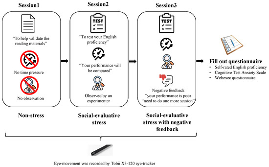 The whole experiment consisted of three sessions in a fixed order. In order to remove the variability caused by the presentation sequence of the reading materials, the current study adopted the Latin square design method to divide the six passages into three blocks of two passages each, with counterbalance order both within and between blocks. Stress was a within-participant factor, with every participant being in the non-stress condition for the first block of passages (session 1), in the social-evaluative stress condition for the second block of passages (session 2), and in the negative-feedback condition for the third block of passages (session 3), as shown in Figure 1. All participants followed a fixed order of stress conditions in three sessions to avoid any stress spill-over effects [42]. In each session, the participant read two passages and answered three multi-choice questions for each passage. Each participant was tested individually. After signing the consent form, the participant was presented with a sample reading task to familiarize them with the format, length, and difficulty of the texts and the types of questions. The sample task also helped reduce the stress effect caused by unfamiliar tasks. Both the on-screen and verbal instructions were given in English.