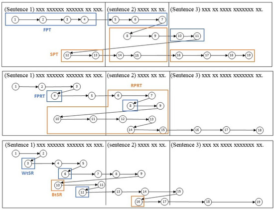 The sentence integration effect can be indexed by the regression path reading time (RPRT). This metric represents the time from the first fixation on the target sentence to when a fixation is made on the subsequent sentence [47,48]. This represents the process of a subject detecting a problem (e.g., syntactic ambiguity) and then rereading the prior area in order to build a concept. The second-pass fixation time (SPT), which is the total duration of all regressions back to the target sentence, reflects the process of integrating and consolidating sentence meanings to build a comprehensive text representation [45].