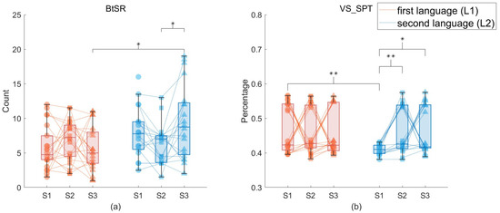 (a) Interaction effect between languages and stress for BtSR. (b) Interaction effect between languages and stress for VS_SPT sessions. S1 = session 1, S2 = session 2, S3 = session 3. * p < 0.05. ** p< 0.01. *** p< 0.001 level. L2 readers performed more between-sentence regressions than L1 readers in session 3 . For L2 readers, they made more regressions in session 3 than in session 2, . For L1 readers, there was no significant difference in BtSR under different sessions.