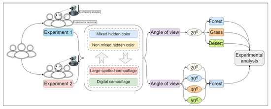 The overall structure diagram of the experiment is shown in Figure 2, where two sets of experiments were set up separately. In Experiment 1, the perspective of all targets was set to , and three backgrounds, including forest, grassland, and desert, digital camouflage, large-spot camouflage, and mixed-color effects, were tested at different positions. Experiment 2 only changed the perspective while keeping the other conditions constant. Two experiments were set up, respectively. In experiment 1, the viewing angles of all targets were set as . The effects of different backgrounds, different camouflage designs, and different positions of disruptive color were tested. The setting method and experimental process of each type of background experiment are entirely consistent. We randomly placed the corresponding 4 digital camouflage targets and 4 large-spot camouflage targets into the corresponding background, and placed the target pattern with disruptive color at the same position and angled in another image with the same background as a control experiment (as shown in Figure 3a). Experiment 2 was conducted in a woodland-type setting. The target size was set to meet the viewing angles of , , , and , respectively, and the target was covered with either large-spot or digital camouflage. The target with non-disruptive color was randomly placed in the woodland background, and another target pattern with disruptive color was set in the same position and angle of the same background to form a control experiment to test the effect of disruptive color at different viewing angles (as shown in Figure 3b). In experiment 1, 6 observation images were taken, including 3 types of background. In experiment 2, there were two observation images. No more than 8 targets were randomly set in each image, and a black screen was inserted to form a visual buffer when switching between images. In the experiment, the participants’ heads were fixed using the chin rest embedded in the Tobii T120, ensuring that the accuracy of eye movement data collection was less than 0.5° of viewing angle. The materials composed of the three backgrounds and targets of the experiment are shown in Figure 3c.