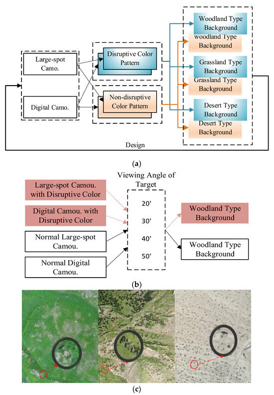 Camouflage technology can control the salient features of the target surface and reduce the detectability of a target; it is widely used in the field of military target camouflage protection by countries all over the world. The traditional view is that the spots in the camouflage patterns should be consistent with the spots in the background [1]. Spots refer to areas of color blocks of different colors, shapes, or sizes. Most of the research on camouflage patterns on moving targets is based on this basic principle. Some scholars call a similar principle ‘background matching’ [2]. In addition to this, disruptive color is a different camouflage principle. Caro et al. [3] first noticed that the camouflage principle of disruptive color and background matching is different. Many subsequent scholars [4,5] have performed research on the mechanisms and application methods of disruptive color. In 2009, Stevens and Merilaita reviewed previous studies, and defined disruptive color as a group of spots that can produce false edges and boundaries, hindering the detection and recognition of the true con tour and shape of the whole target or part of the target [6].
