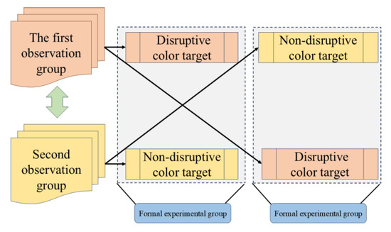 Setting up an utterly similar control group can eliminate the effect of other distractions. However, subjects observing the control experiment at the same time will introduce prior information for eye-tracking experiments, which will induce a large error. The first group observed non-disruptive-color targets, and the second group observed disruptive-color targets. The first group of participants observed the disruptive-color targets in the formal experimental group and the non-disruptive-color targets in the backup experimental group. The second group of participants observed the non-disruptive-color targets in the formal experimental group and the disruptive-color targets in the backup experimental group. The experimental process is shown in Figure 4.