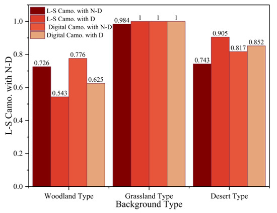 Therefore, the indexes of the two targets show no differences. In the desert-type background, the contrast of disruptive color inside the target is higher than that of spot brightness in the background, so the disruptive-color target is more obvious in the background. This is consistent with the research of Lin et al. [36]—that is, the contrast in the target higher than the background is not conducive to camouflage. In the woodland-type background, the disruptive-color targets produced better results. This is mainly due to the low-brightness shadow spots caused by the height differences of trees in the woodland-type background, resulting in high brightness contrast in the background, which increases the complexity of the background. It can be seen that whether or not disruptive color can produce a better camouflage effect than pure background matching is related to background. In fact, for natural backgrounds, background complexity is closely related to observation resolution. Some of the literature [37,38] studied the background scale corresponding to small-sized animals, such as moths, which is different from the background scale and background complexity corresponding to military targets. Therefore, the characteristics of the overall background should be carefully studied when determining the disruptive color.