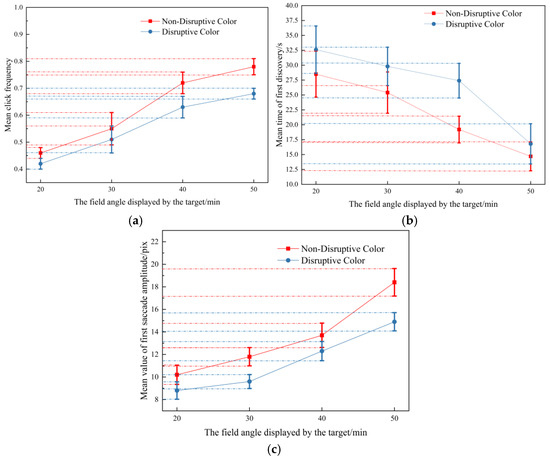 The mean values of the three indexes of disruptive color and non-disruptive color are plotted as curves, respectively. The results are shown in Figure 6. The upper and lower bars in the figure represent this data group’s standard deviation. The uniform rule of three indexes for the mean value of all the disruptive-color and non-disruptive-color targets shows that the observation difficulty of disruptive-color targets is higher than that of non-disruptive-color targets. Moreover, the bigger the target, the easier it is to find. According to the overlap of some standard deviation bars, individual targets in the sample have different performances, which indicates that the effect produced by the disruptive color is most likely related to the location and background of the target. In addition, by observing the trend in the mean value of the target click frequency from all viewing angles, the mean value of the first discovery time of the target of , and , and the mean value of the first saccade amplitude of the target of , and , it can be found that the disruptive-color and non-disruptive-color contrast will make the index value of the target with a larger viewing angle change more.