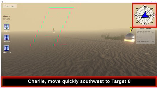 The subtitled instructions were displayed at 12 characters per second. Each subtitle could contain up to 63 characters in a line, and subtitles for each player were issued every five seconds. The time intervals for providing instructions to GPs were set to five seconds to ensure that each participant received an adequate number of instructions. The sentence structure included a comprehensive set of comprehensible command structures consisting of Name, Verb, Directional Words, Target Number, Destination, and Modifier. The subtitled instructions were presented at the bottom of the screen (see Figure 1). Each modality of the subtitled instructions (visual only, auditory only, or visual–auditory) lasted for 7 min, with the order of presentation randomized for each participant.