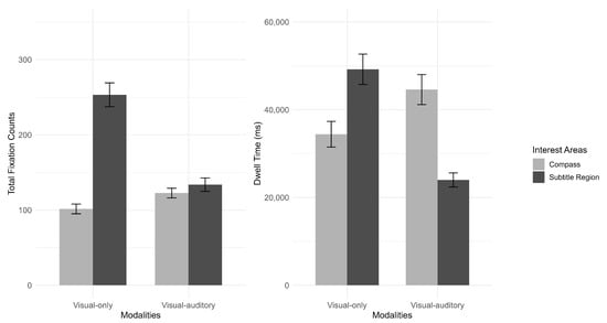 Total fixation counts and dwell time on compass and subtitle region in visual-only and visual–auditory modality (The error bars represented standard error).
