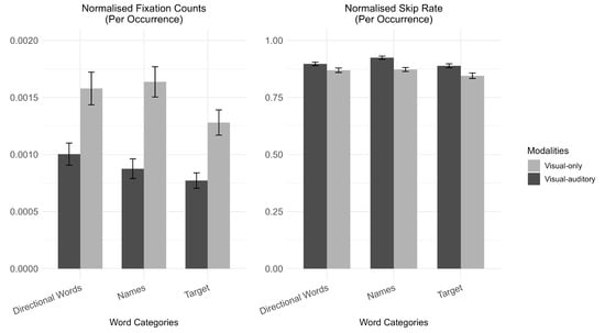 Word skipping rate: The raw data for the word skipping rate of each word is standardized as word skipping rate = (total skipped occurrences/total occurrences). The word skipping rates were analyzed using a generalized linear mixed model with a binomial distribution. Participants exhibited a significantly higher word skipping rate in the visual–auditory modality compared to the visual-only modality (estimate = 0.279, 95% CI [0.158, 0.400], p < 0.001). Interactions were found where p-values were adjusted with the Tukey method. In particular, “Names” were skipped more frequently in the visual–auditory modality compared to the visual-only modality (estimate = −0.590, 95% CI [−0.721, −0.459], p < 0.001), a pattern not consistently observed in other word categories or modality combinations (see Table 1 and Table 2).