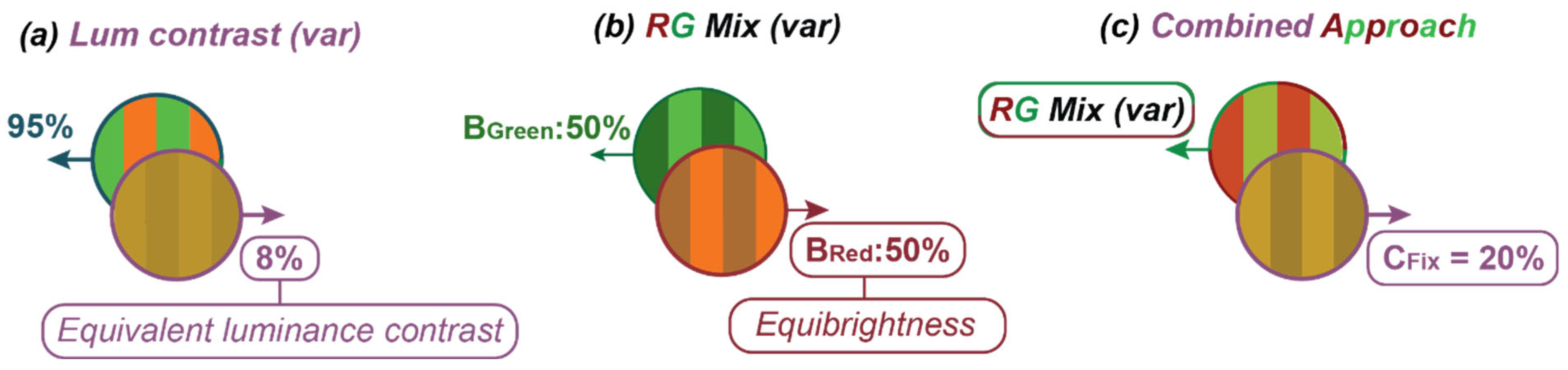 9]. In this case, a CVn participant should experience equi-brightness at an equal ratio of red to green (i.e.,