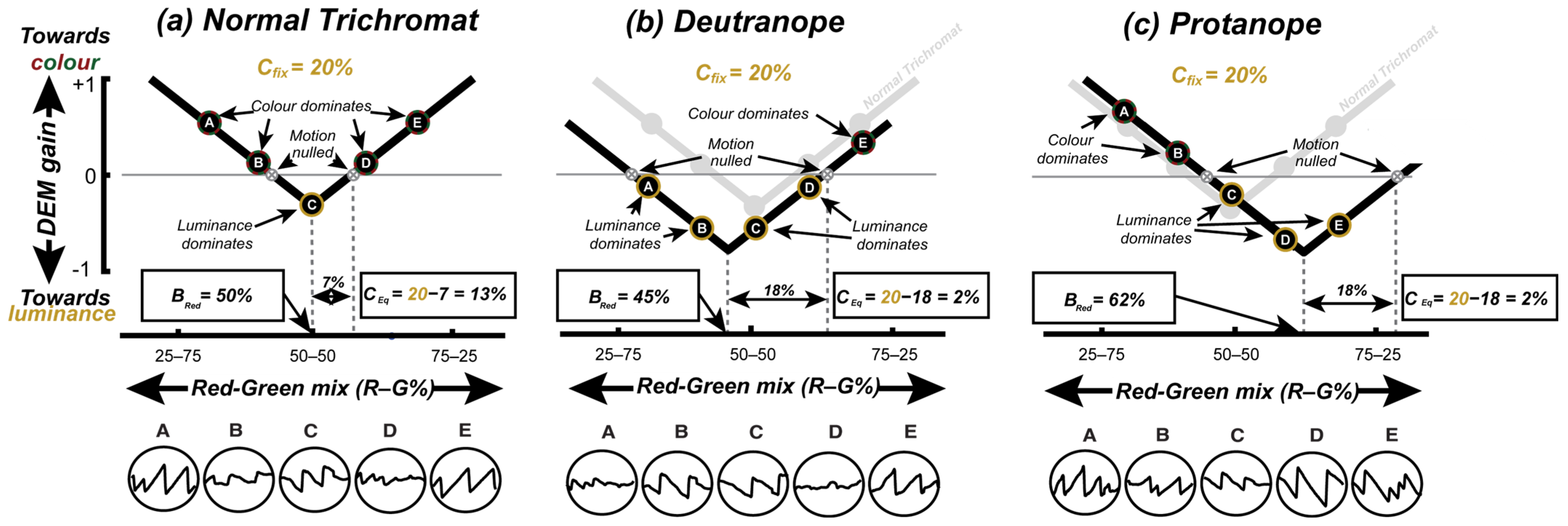Consistent with our previous findings, a subset of normal trichromats were misclassified in the current study. In our earlier work, we showed that these misclassifications were not due to deficits in colour vision but instead reflected variability in participants’ optokinetic responses. Specifically, we identified a form of “response bias”, where DEM responses fluctuated between tracking the chromatic component of the stimulus and residual luminance signals. This likely occurred because participants were instructed to “follow the stimulus”, and when motion cues were ambiguous, some appeared to switch arbitrarily between components.