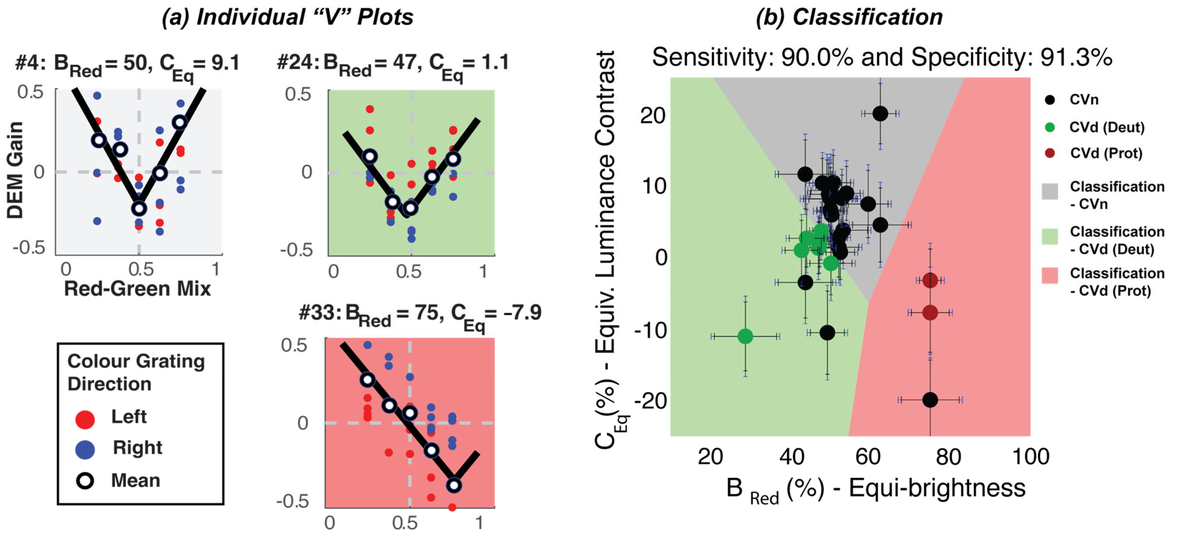 Figure 3a shows the pattern of responses across three participants (with different colour vision statuses) observing stimuli moving with a fixed luminance contrast of 20%. Plots in the white, green, and red panel show data from a CVn, deuteranope, and protanope individual, respectively. Red and blue symbols show gain estimates from trials when the coloured grating moved left or right, respectively, with the mean gain across trials indicated by open symbols. Note that while the protanope (red panel) has a V-function shifted to the right, the deuteranope (green panel) has a V-function that is almost symmetrical around the physical equiluminance (similar to the CVn). As such, while