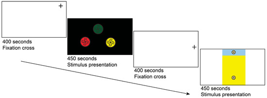 Eye-tracking metrics, including Time to First Fixation (TTFF) for initial attentional guidance and dwell time for sustained attention. To prevent central fixation bias, a fixation cross was displayed outside the stimulus area for 400 ms (Figure 1), followed by a 450 ms stimulus presentation and a subsequent fixation cross. A 450 ms stimulus presentation was chosen to simulate brief exposure in real-world visual interfaces (e.g., mobile apps or packaging) and to minimize multiple fixations, focusing on initial attentional capture. This duration, while increasing TTFF variability, ensured ecological validity for rapid visual processing tasks.