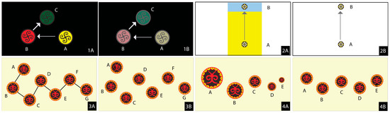 Stimuli for A/B testing: (1A) bright color, (1B) dull color; (2A) layered, (2B) non-layered; (3A) line-connected, (3B) non-connected; (4A) large-to-small size, (4B) equal size.