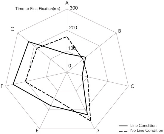 Time to first fixation (TTFF) is compared between the line and no-line conditions across seven AOIs (Figure 3). Overall, the effects of line cues on TTFF are small. For AOIs G, F, and E, TTFF is slightly longer in the line condition than the no-line condition, but these differences are nonsignificant (e.g., AOI F: M = 263.84, SD = 201.66 vs. M = 204.59, SD = 214.80), t (33) = 1.22, p = 0.230, d = 0.21. By contrast, AOIs D, C, and B show slightly faster TTFF in the no-line condition, but again the effects are trivial and nonsignificant (e.g., AOI C: M = 74.30, SD = 132.15 vs. M = 101.79, SD = 156.06), t (33) = −0.96, p = 0.344, d = −0.16. The only significant effect is observed at AOI A, where participants fixated faster in the line condition (M = 87.17, SD = 137.97) compared to the no-line condition (M = 168.49, SD = 238.35), t (33) = −2.16, p = 0.038, d = −0.37, indicating a small-to-medium effect. Thus, AOI A was the primary area where line cues successfully guided initial attention.