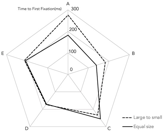 Time to First Fixation (TTFF) does not significantly differ between the large-to-small and equal-size conditions across AOIs (Figure 4). For example, at AOI E, TTFF was nearly identical between conditions (M = 211.77 ms vs. 207.68 ms), t (33) = 0.08, p = 0.940, d = 0.01. Similarly, nonsignificant effects are observed at AOIs D and C (ds ≤ 0.11). A trend toward faster fixation in the large-to-small condition is observed at AOI B (M = 182.55 ms vs. 138.06 ms), t (33) = 1.70, p = 0.098, d = 0.29, although this does not reach corrected significance. Likewise, AOI A showed a significant difference, with longer TTFF in the large-to-small condition (M = 276.72 ms) compared to equal-size (M = 182.54 ms), t (33) = 1.98, p = 0.056, d = 0.34.