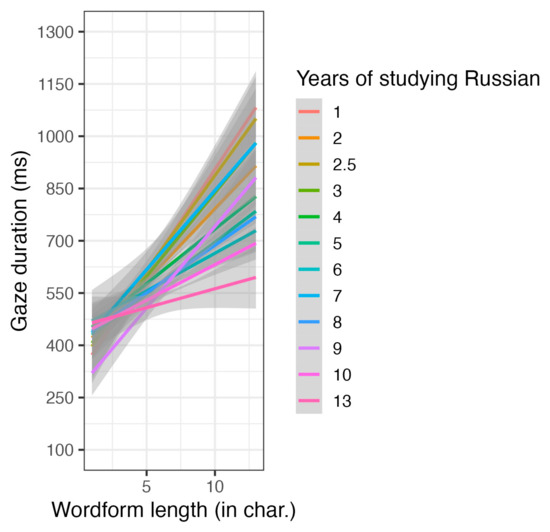 We ran two separate models for L1 and L2 readers (see Appendix A, Table A2 and Table A3) and found significant main effects of word length and wordform frequency in both groups. For L2 readers, the only significant interaction was between the duration of studying Russian and word length (see Figure 2). They read longer words more slowly, particularly in the early stages of learning Russian. However, there was no main effect of the duration of studying Russian on gaze duration itself.